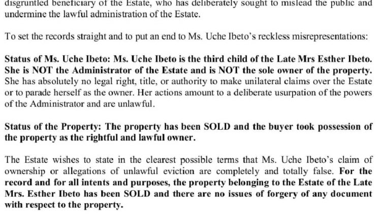 “The Estate wishes to state in the clearest possible terms that Ms. Uche Ibeto’s claim of ownership or allegations of unlawful eviction are completely and totally false. For the record and for all intents and purposes, the property belonging to the Estate of the Late Mrs. Esther Ibeto has been SOLD and there are no issues of forgery of any document with respect to the property.”